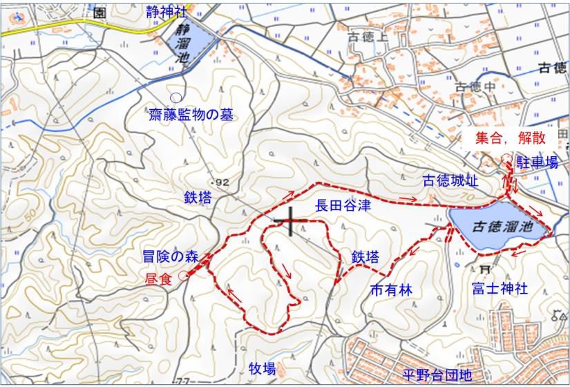 〇観察コース:古徳沼白鳥見学者駐車場⇒古徳沼周回路⇒那珂市有林⇒鉄塔⇒ロータリーの森周回コース⇒冒険の森(昼食)⇒長田谷津林道⇒古徳沼(地図参照)