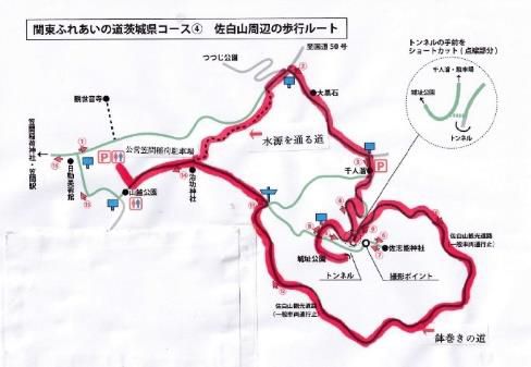 3. 観察ルート:公営笠間稲荷駐車場⇒山麓公園⇒治功神社⇒登山道⇒鉢巻の道(反時計回り)⇒トンネル⇒城址公園(本丸跡)⇒千人溜(昼食)⇒大黒石⇒水源を通る道⇒山麓公園⇒公営笠間稲荷駐車場(①地図参照)